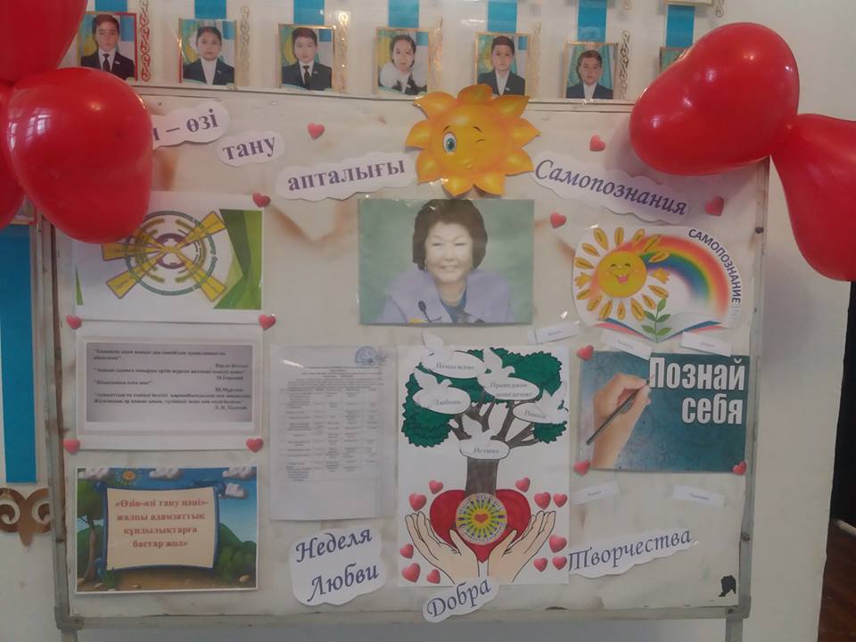Ы.Алтынсарин атындағы ЖОББМ өзін-өзі тану «Махаббат пен шығармашылық» педагогикасы атты онкүндіктің ашылу салтанаты өтті. Мақсаты: «Өзін-өзі тану» адамгершілік-рухани білім беру бағдарламасының негізінде жататын тәрбие және білім беру жүйесінде балалар мен жастардың адамгершілік-рухани жетілдіру идеясы оқушыларды жалпы адами құндылықтар әлеміне тартып, адами қарым-қатынас нормасымен таныстырады, азаматтық мәдениетке қалыптастырады және дамытады.